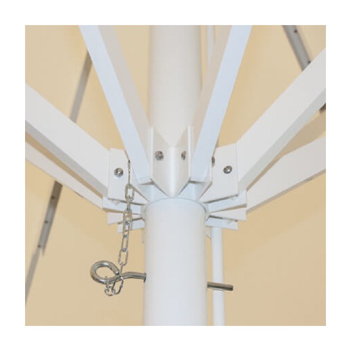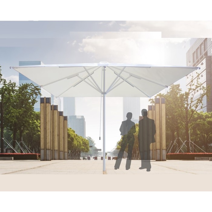 Parasol de aluminio cuadrado de aluminio pintado epoxy en color blanco.
